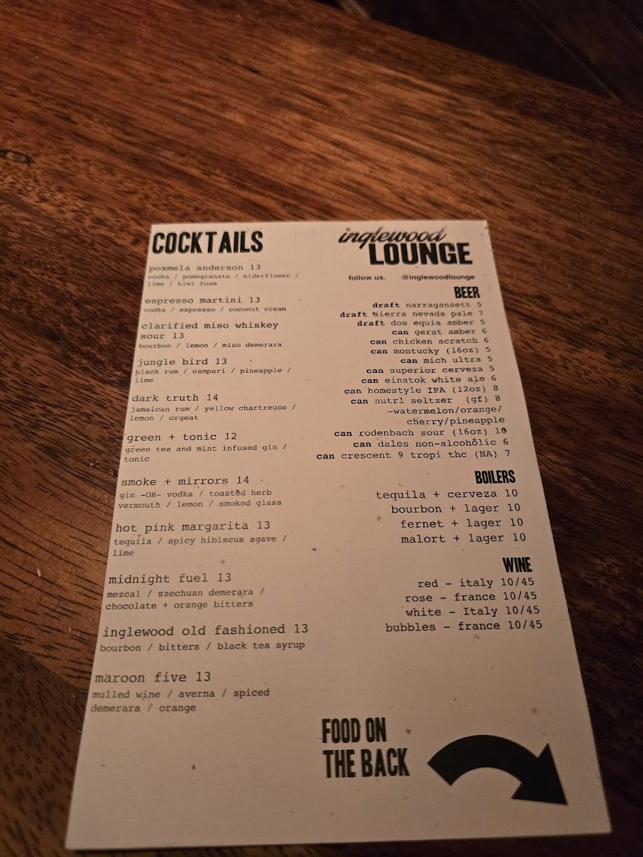 All dishes reflect a commitment to quality and local sourcing, ensuring every bite is packed with flavor. Whether you’re unwinding after work or hanging out with friends, the culinary offerings at Inglewood Lounge make it an ideal destination for food and fun.
